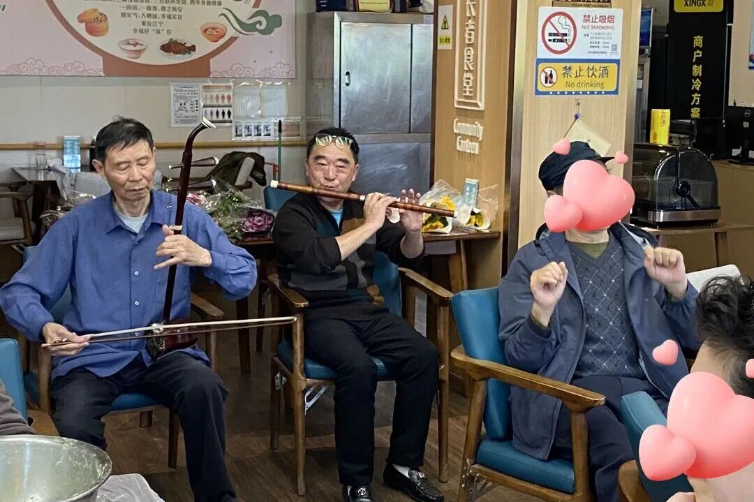 团子蒸制的间隙,爱老家园民乐队的三位成员前来助兴,二胡、笛子等民乐齐奏《洪湖水浪打浪》,悠扬的旋律瞬间点燃现场气氛,不少家人跟着打拍子、轻舞,曲终时掌声雷动。