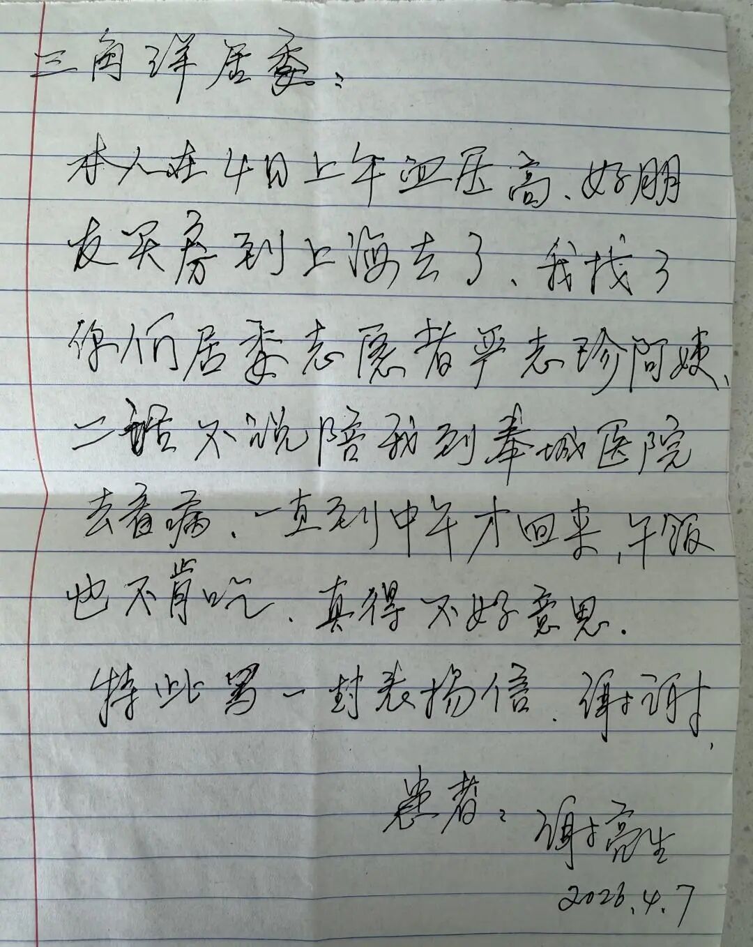 志愿者们对自己格外节俭,却对老人毫不吝啬,打车送医、垫付快递费从不犹豫。紫苑东区独居老人老周因糖尿病卧床、三日未进食,志愿者胡阿姨发现后立即照料、联系家属,让父女得以见上最后一面。文化小区老谢血压骤高,志愿者严阿姨全程陪同就医,获老人亲笔表扬。