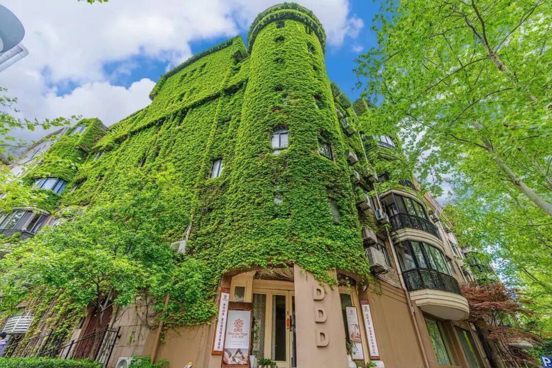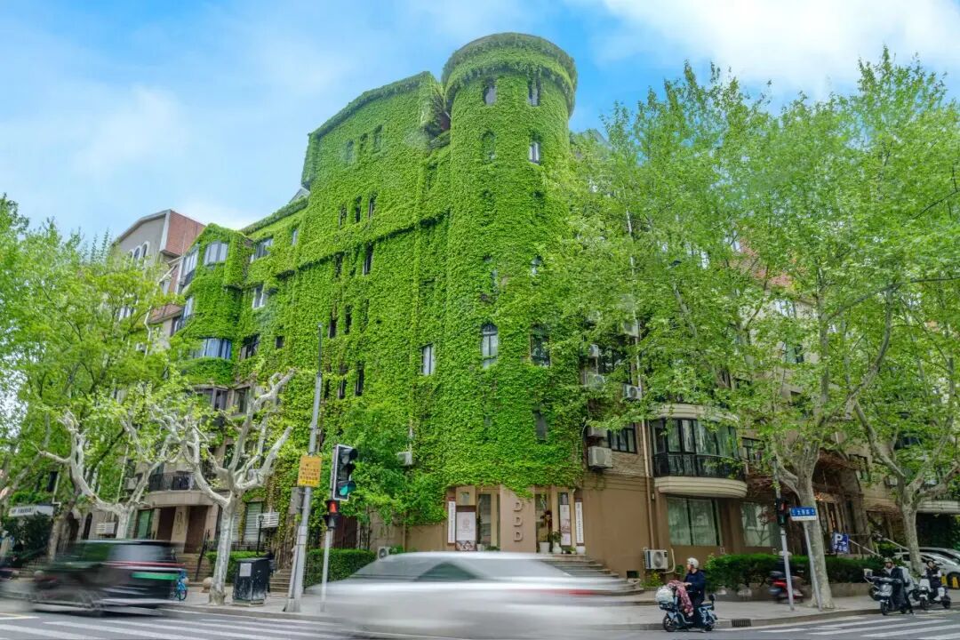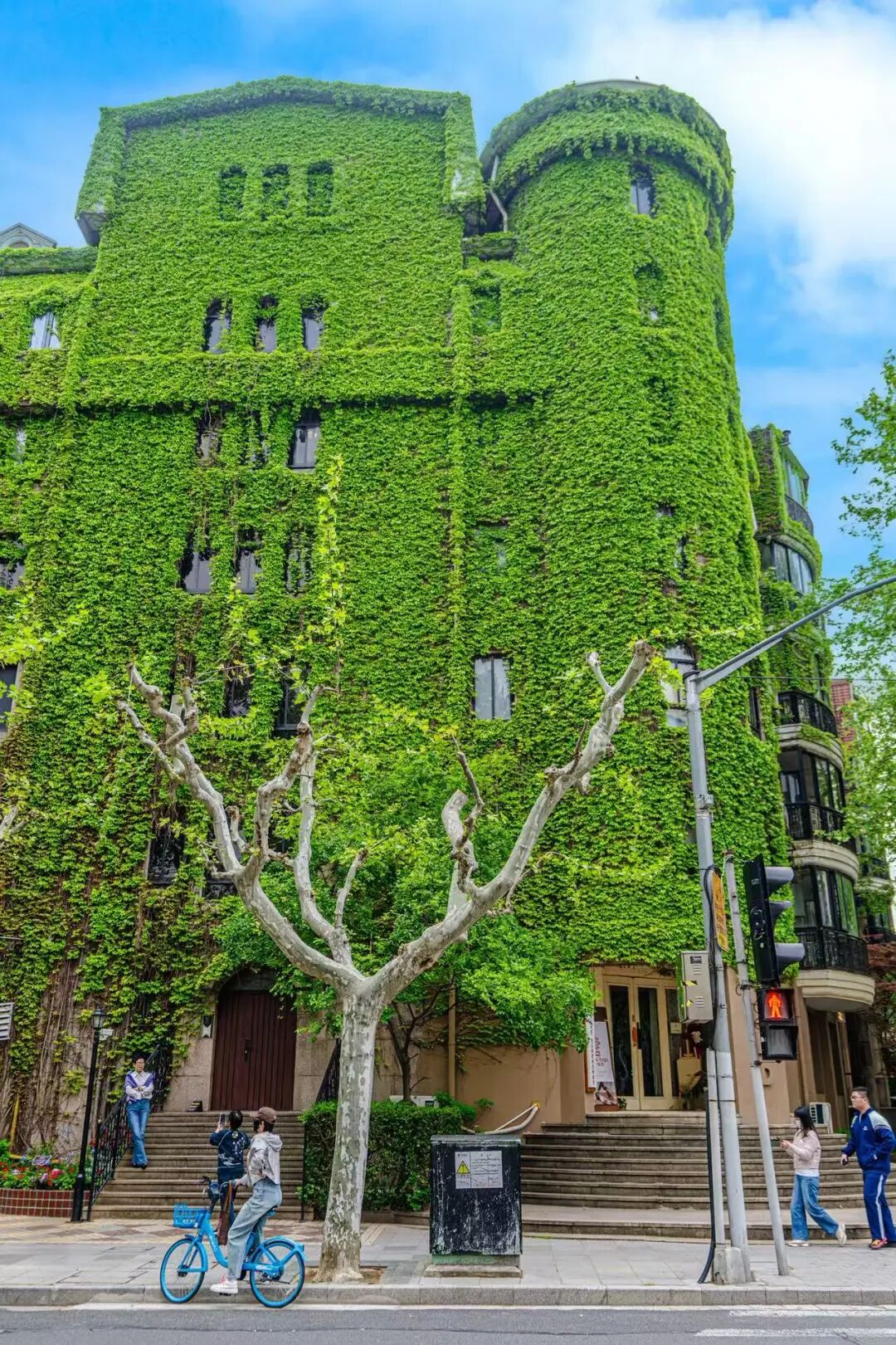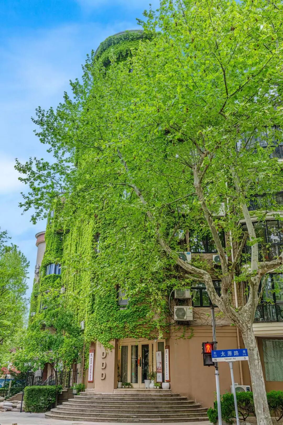 “网绿大楼”位于永嘉路425号,地处永嘉路与太原路交叉口,是1995年建成的达汇花园公寓的一部分。复古的建筑风格与周边百年历史的洋房相邻,新旧交融,尽显海派风情。楼宇西侧的整面墙被爬山虎(地锦)完全覆盖,浅米色的圆拱窗和雅致的弧形楼梯在叶丛中若隐若现,氛围感拉满。春日的新叶透着鲜嫩透亮的绿色,阳光洒下时,叶色层次分明、光影交织,在路口对角就能拍到完整的森系美景,午后光线柔和,是拍摄的最佳时机。