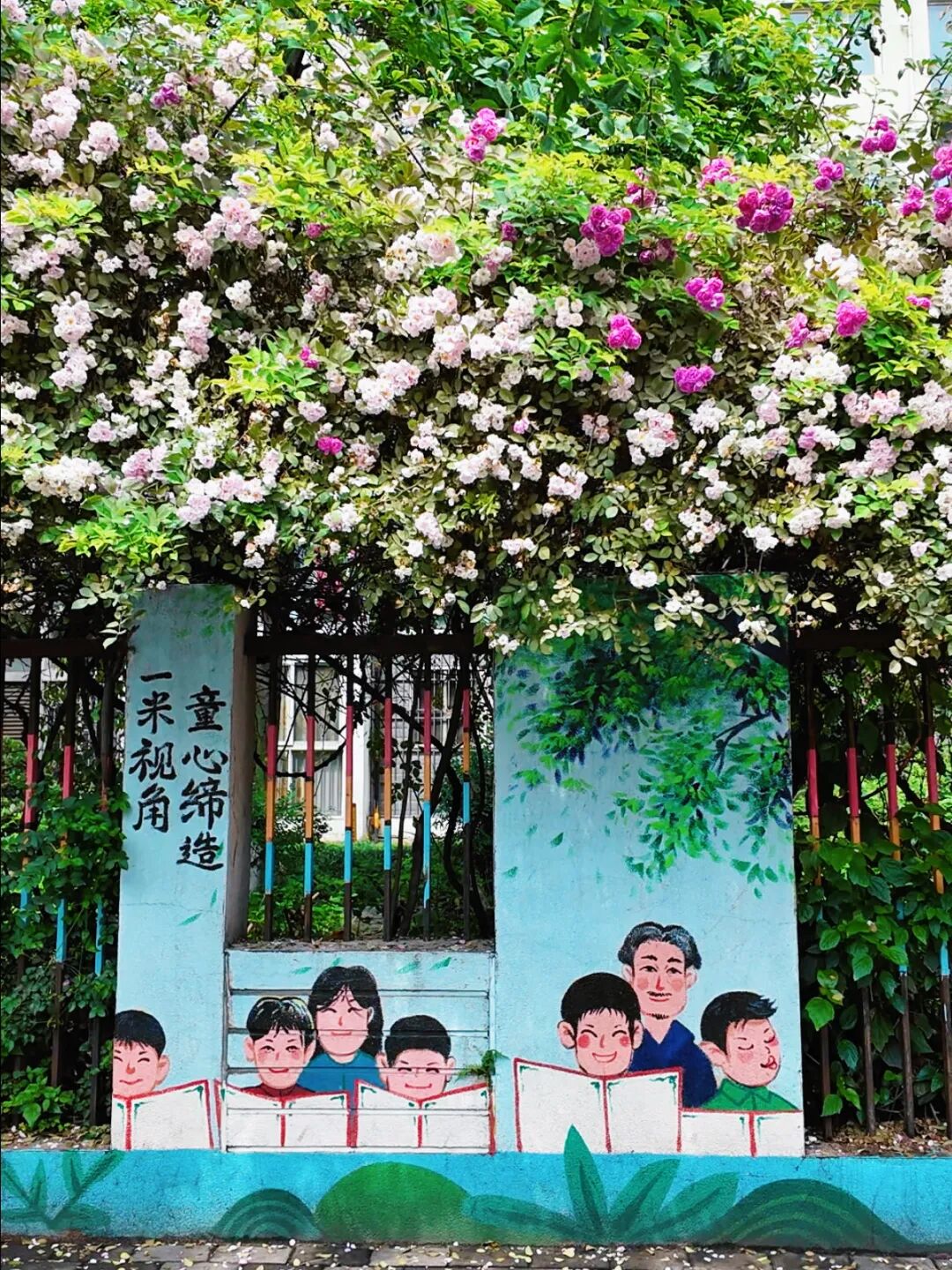微风拂过,花枝轻轻摇曳,细碎的花瓣簌簌飘落,暗香浮动,清甜的气息漫过街巷,融入每一寸空气里。墙下的童趣彩绘与繁花相互映衬,放学的孩子牵着家长的手走过,笑声伴着花香,让平凡的回家路满是治愈的暖意。