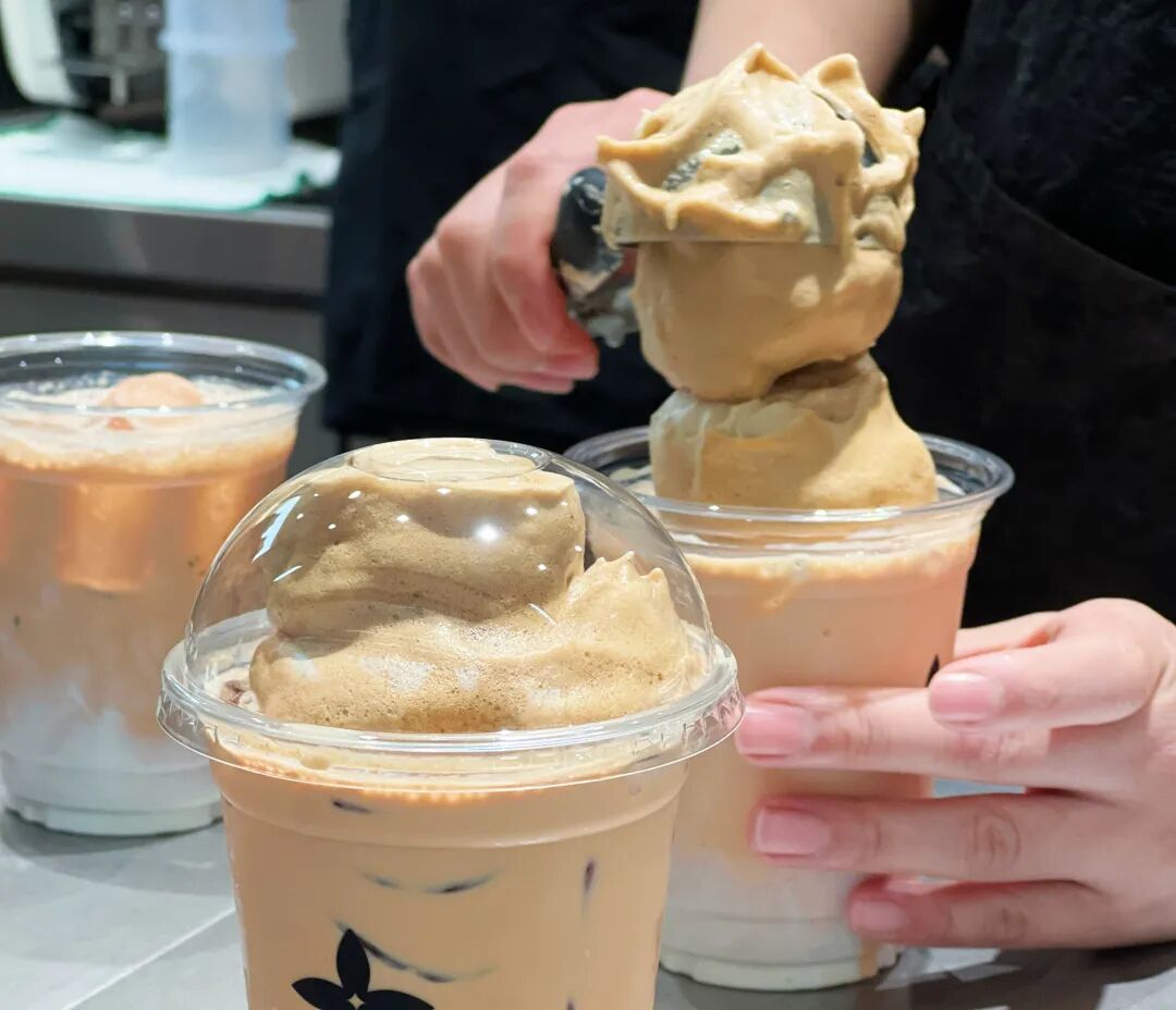 “400次鸳鸯泰奶”结合了热门泰式奶茶与咖啡,顶部是需打发400次的绵密咖啡云顶。用勺挖吃奶盖时,咖啡香气明显;底部泰奶与咖啡融合,草木香、咖啡果香、咸酪乳香交织,口感醇厚香甜,如同甜品般诱人。