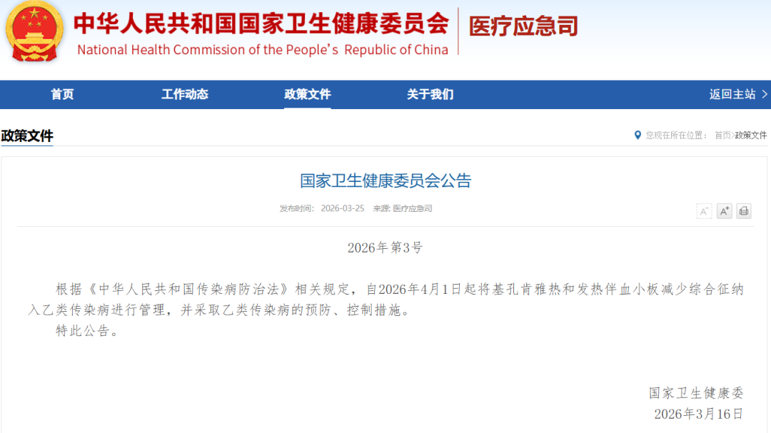 根据国家卫生健康委发布的公告,自2026年4月1日起,“发热伴血小板减少综合征”被正式纳入乙类传染病管理,其预防控制措施与艾滋病、结核病、流行性出血热、登革热等处于同一级别。