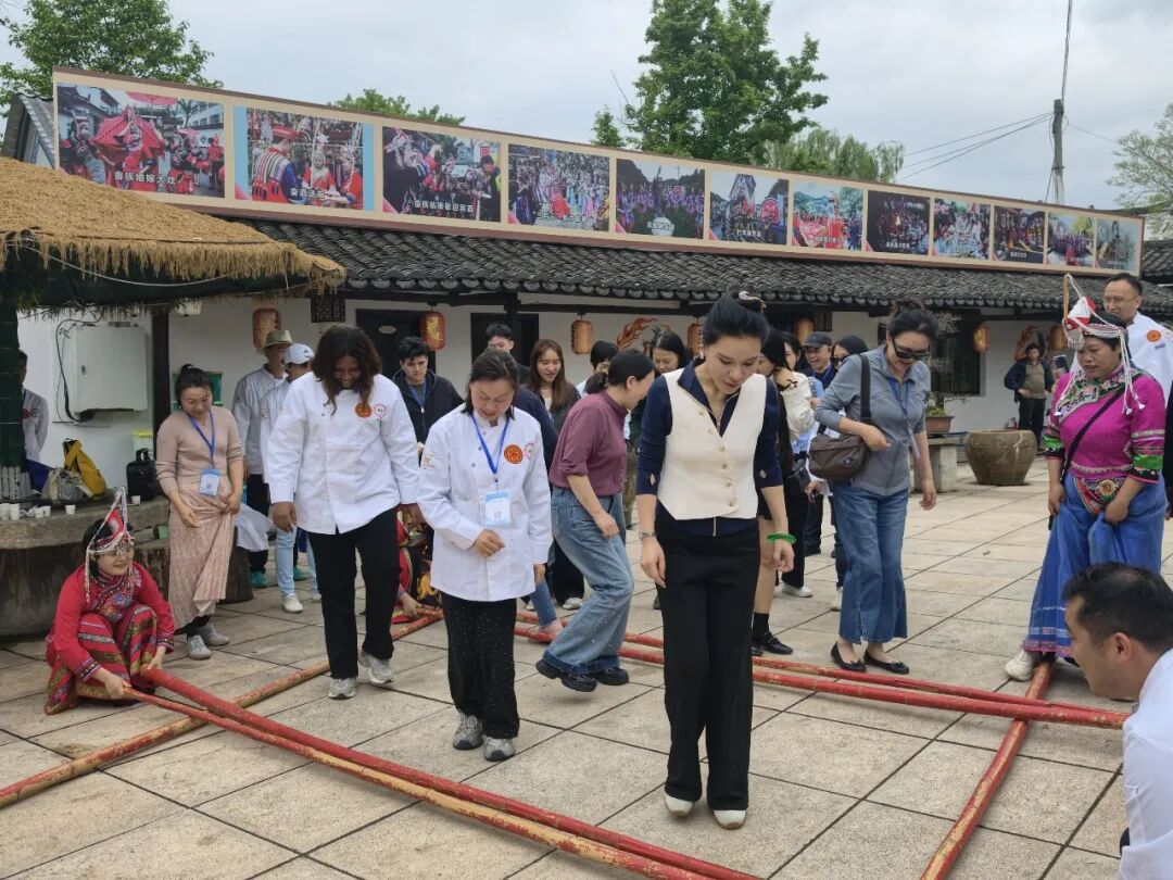 探访完游埠古镇,学员们又前往水亭畲族乡,在浓郁的畲乡风情里继续美食之旅。在当地村民的带领下,大家体验了打麻糍、跳竹竿舞。村民们还为大家介绍了白壳辣椒、白黄瓜、马兰头、“雪里蕻”雪菜等本地特色食材,兰溪小萝卜和兰溪牛肉面更是成为众人关注的焦点。