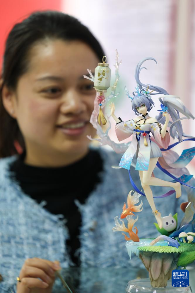 4月17日,一名女工在毕节高新技术产业开发区的一家动漫手办生产企业内展示手办。刘续 摄