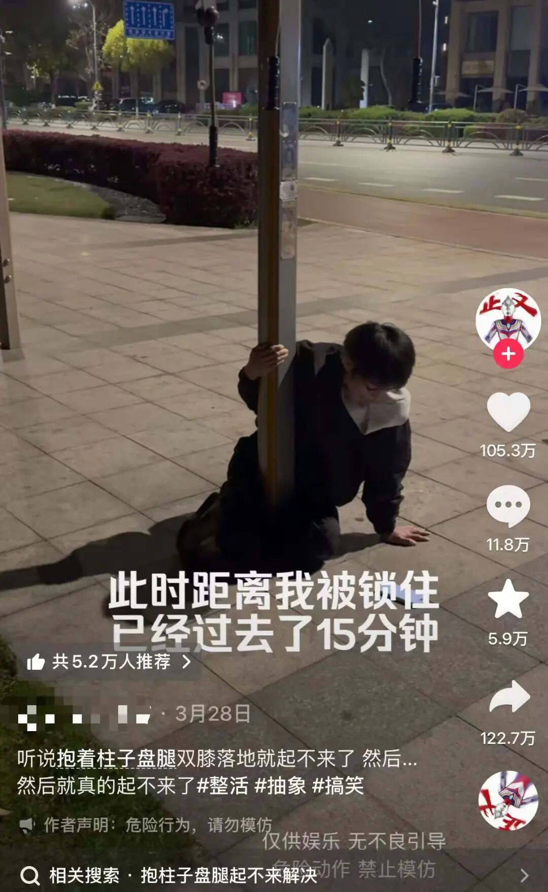 近期,“盘腿抱灯柱挑战”在多个社交平台走红,参与者需双腿盘绕夹住路灯柱后尝试挣脱,不少人跟风模仿。