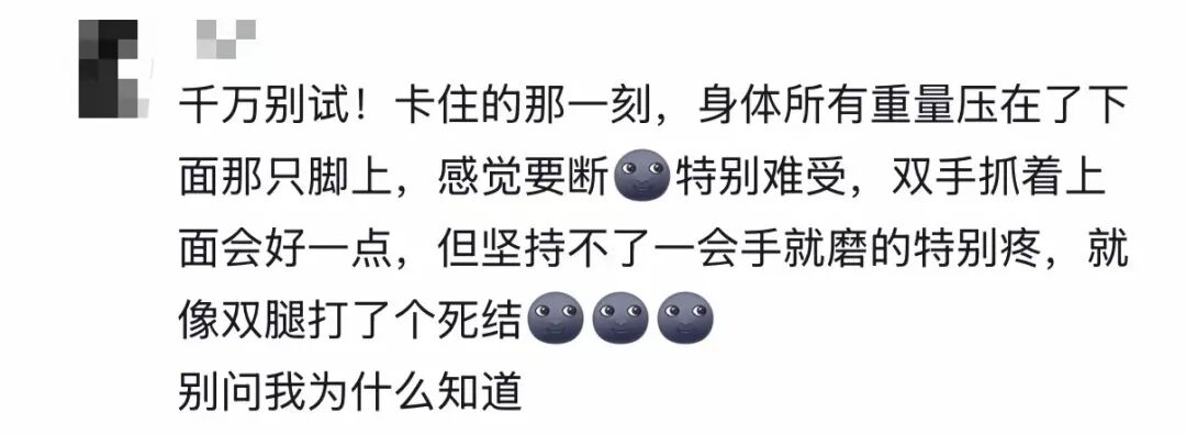 民警提醒,这类网络挑战动作存在安全隐患,膝关节极度屈曲、旋转并承受全身重量,易致半月板撕裂、韧带损伤、肌肉痉挛。挣扎会加重危险,下肢血管持续受压短时间内就会麻木肿胀,长时间脱困不了还可能引发肢体缺血性坏死,切勿因好奇冒风险。