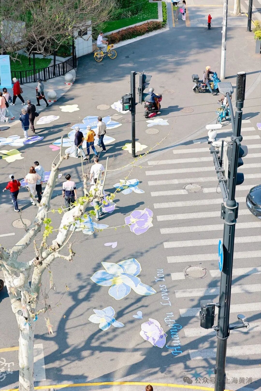 首次把花艺融入城市交通空间的马路地贴「心花怒放,爱在黄浦」,让每次过马路都像奔赴爱的旅程;