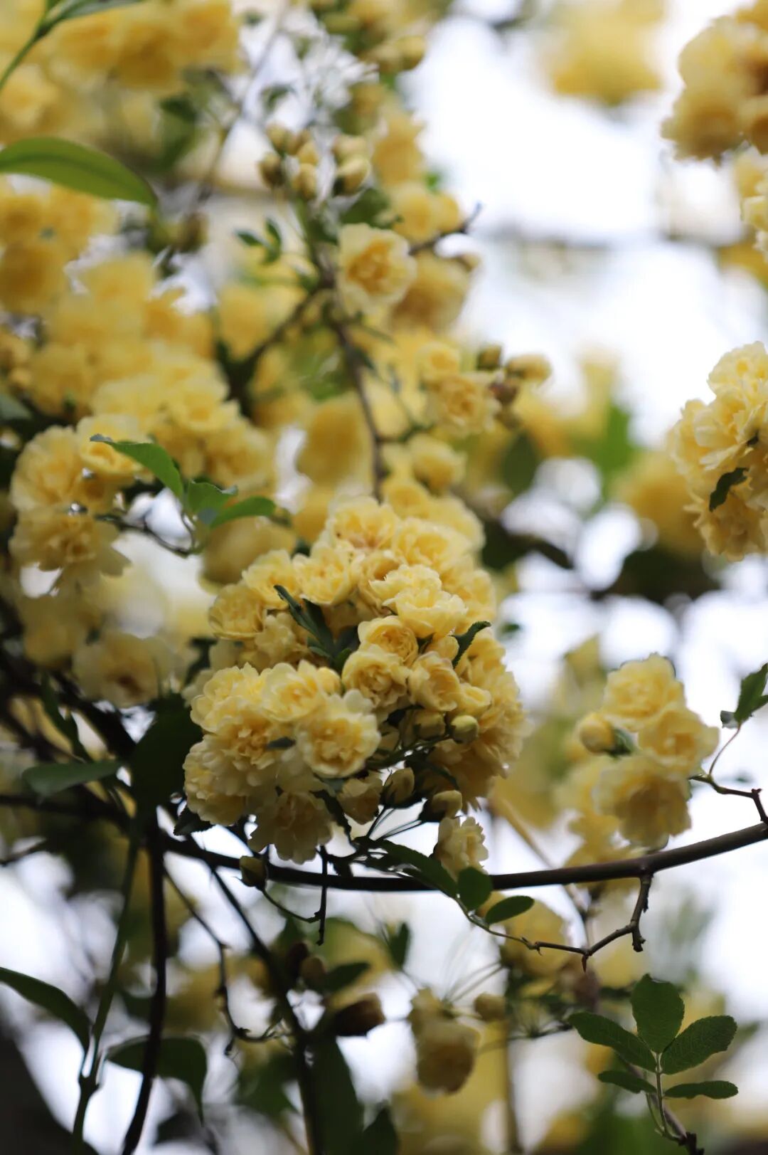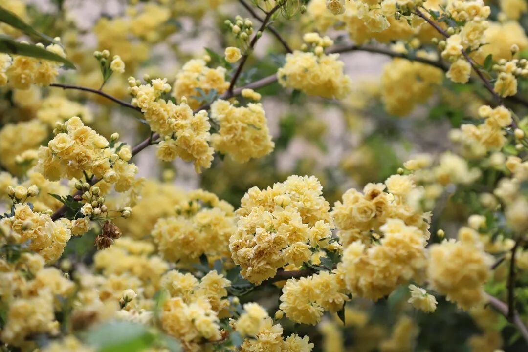 黄木香正值盛放。万千小黄花簇拥着,从墙头、廊顶倾泻而下,细碎如剪碎的阳光。站在花下抬头,整个人都被点亮——不是被光线,而是被那份毫无保留的灿烂。