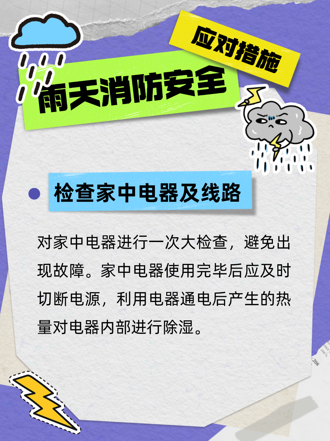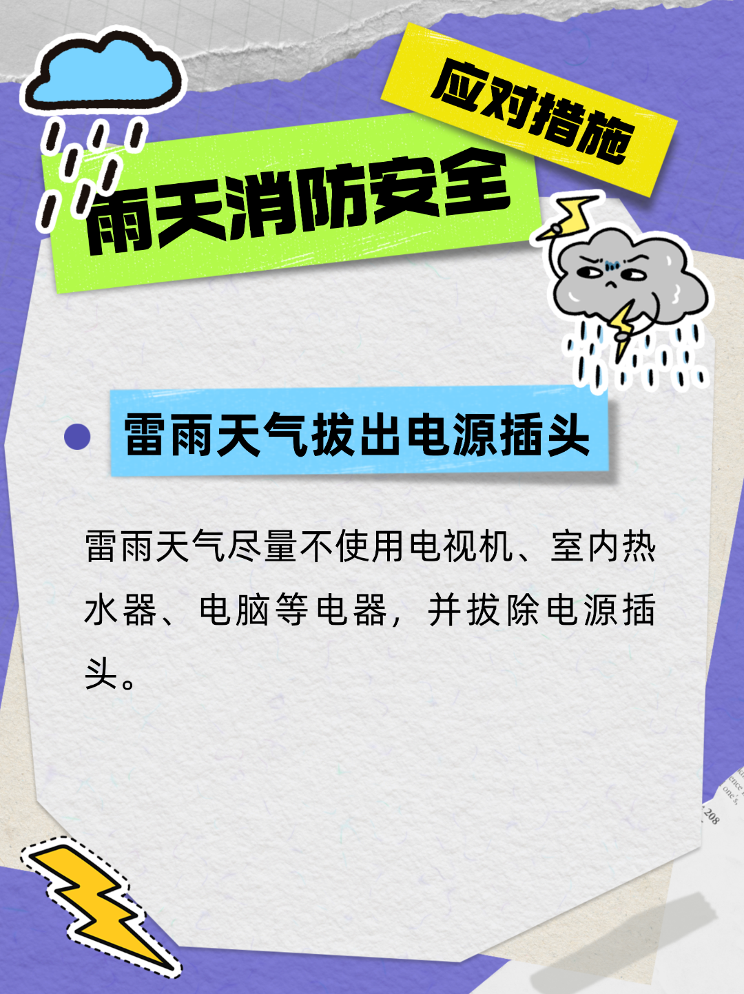 雷雨天时,最好把家用电器的电源切断,还要拔掉电源插头;不要使用带有外接天线的收音机和电视机,也不要接打固定电话。