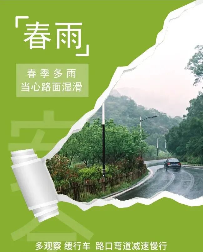 1、春季雨水较多,雨后路面湿滑会降低轮胎附着系数,行车时要仔细观察路况,加大与前车的距离,减速缓慢行驶。