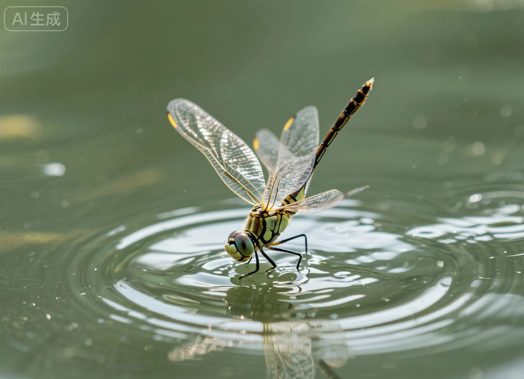 蜻蜓喜欢在水面上飞,有时会用尾巴轻轻碰一下水面,这就是大家说的“蜻蜓点水”。其实呀,这是雌蜻蜓在产卵呢。雌蜻蜓通常会选在水里或者水草上产卵来繁殖宝宝,这些卵孵化后会变成幼虫,我们叫它水虿(chài)。