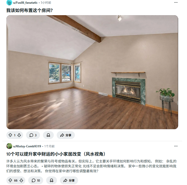 国外风水社区(如Reddit风水板块)讨论的多是实际问题,比如“如何布置房型”,提到“改财运”也多解释为“环境影响心态”。