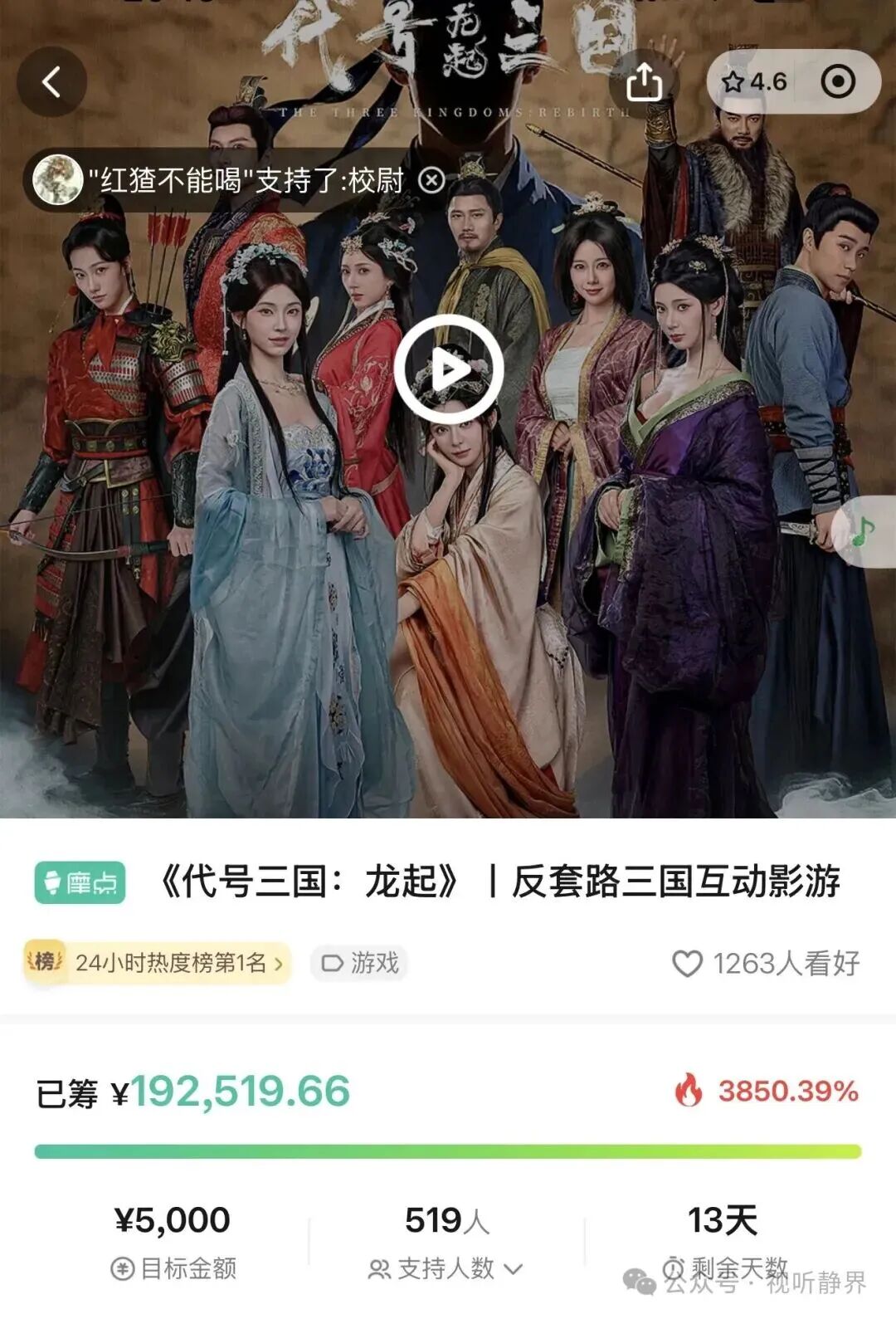4月14日晚8点,静安“视听静界·π空间OPC社区”的入驻企业中景创联(上海)文化发展有限公司,在摩点平台为其出品的大型古装真人互动影游《代号三国:龙起》开启周边衍生品众筹。活动一上线就点燃玩家热情,原定5000元的众筹目标瞬间达成,仅5分钟,众筹金额峰值就突破19万元。