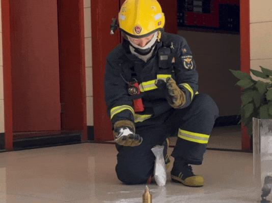 消防员将面粉装入带孔罐子,用脚踩打气筒使面粉形成粉尘云扩散到密闭塑料袋内,接触明火后瞬间燃烧,气浪冲开塑料袋。