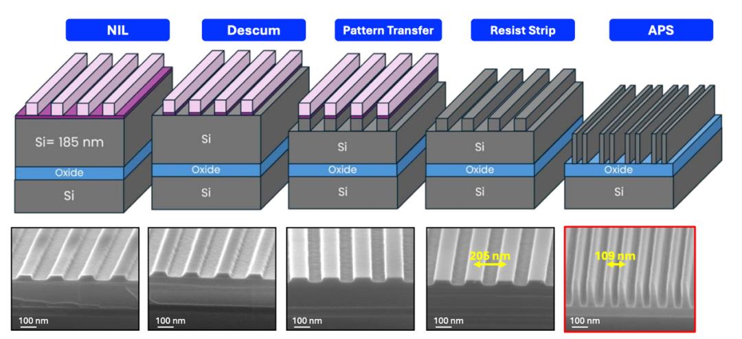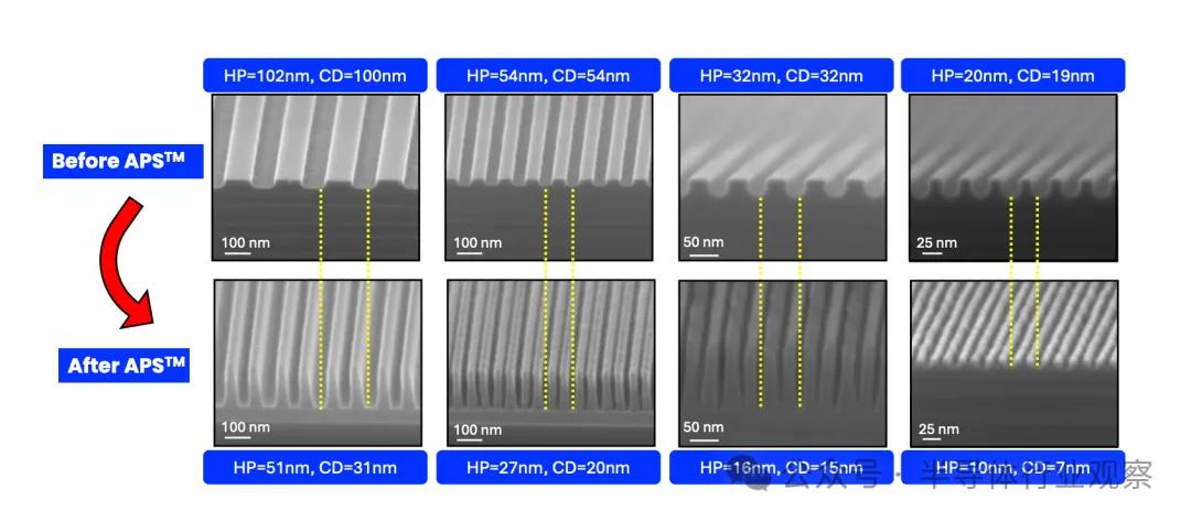 AlixLabs还演示了APS嵌入真实工艺流程的方式:NIL(纳米压印)→清理残胶→图形转移→去胶→APS。先用传统方法做出较粗结构,再用APS进行原子层刻蚀分裂,可实现从205nm→109nm的直接减半,且无需额外光刻。