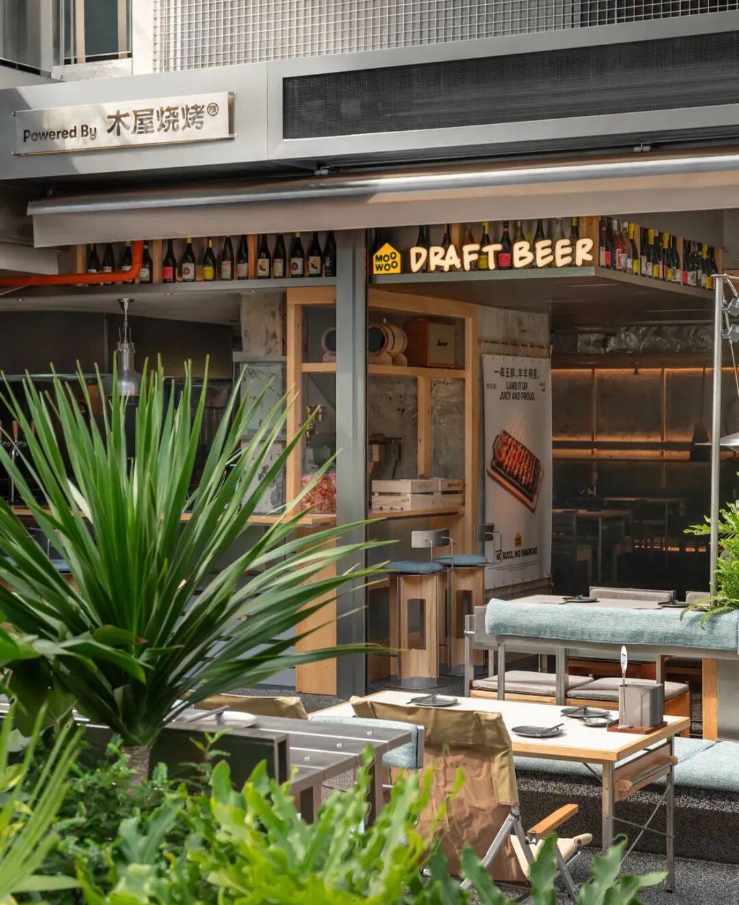 虽说是烧烤店,但初看却不太像传统烧烤店的样子。这家门店定位为烧烤Bistro,是木屋烧烤在传统门店基础上的全新升级。和以往木质排挡风、充满热闹烟火气的风格不同,MOOWOO的店面是一幢两层的独栋小楼,周围环绕着大量绿植,营造出满满的松弛感与氛围感。