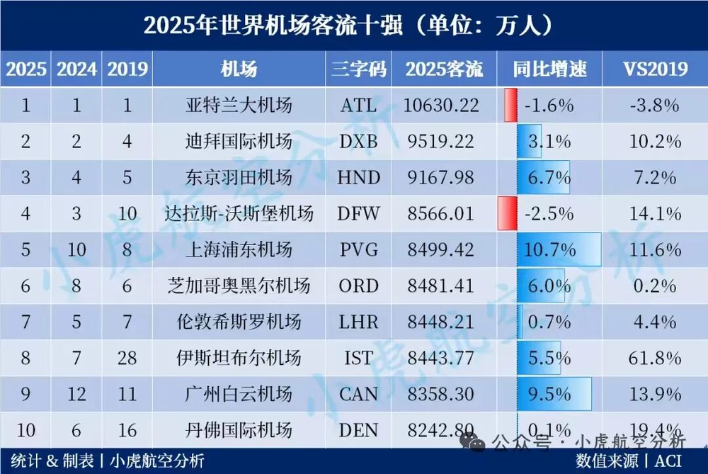 亚特兰大机场、迪拜国际机场、东京羽田机场、达拉斯-沃斯堡机场、上海浦东机场占据前五名。广州白云机场也重新进入全球前十行列。