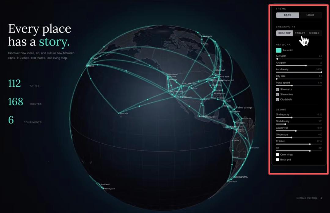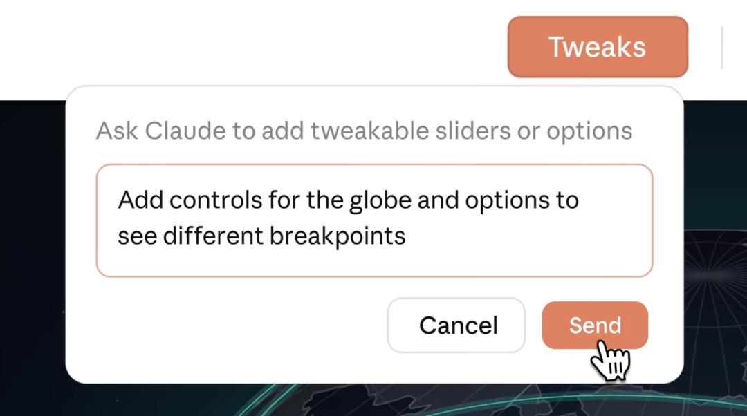 若对第一版设计结果不满意,可使用Tweaks(调整、微调)功能优化。同样用一句话需求,让Claude为第一版的地球组件添加交互组件,用于查看不同断点选项。