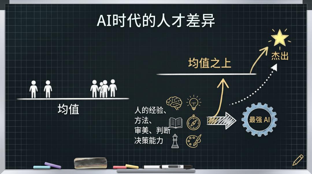 若不理解这句话,可思考一个问题:当大家都用上最强AI后,人与人的区别如何产生?