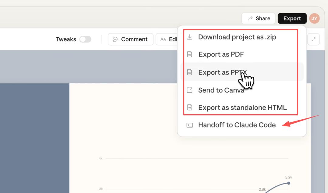 设计结果支持多种格式导出,包括压缩文件、PDF、PPT,还能发送到Canva或导出为HTML网页。更厉害的是,可将设计成品提交给Claude Code,直接完成从设计到开发的全流程。