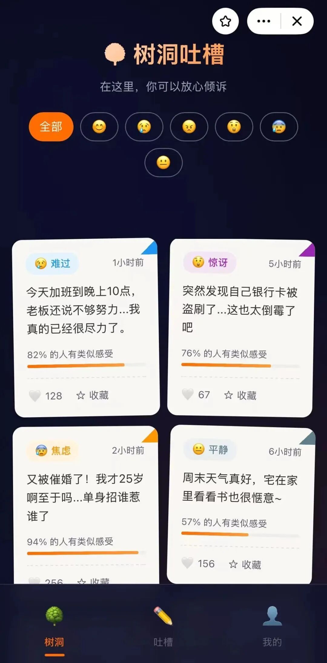 比如,一个叫做“匿名树洞吐槽”的小应用,界面上都是小便利贴形式的吐槽:“加班到10点还被老板PUA”“25岁就被催婚至于吗”,而每条贴士上还会标注XX%的人有类似感受,这个比例是随着大家的点赞实时变化的,如果你也有共鸣,就为它点个赞,把这条吐槽顶到前排。
