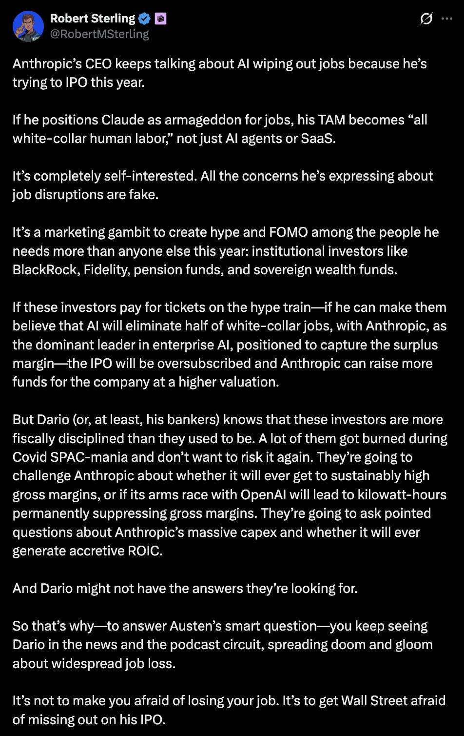 Dario Amodei不断描绘岗位大规模消失的未来,仿佛在敲响警钟: