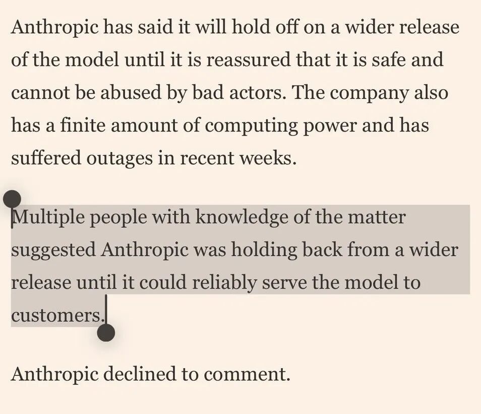 FT引述多位知情人士爆料,戳破神话:真正拖慢模型发布的,不是「太危险不敢放」,而是「太耗资源,根本带不动」。
