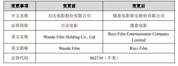 今年3月和4月,万达投资、万达电影先后更名,分别改为“北京儒意投资”“儒意电影”,如今证券名称的更换也在预料之中。