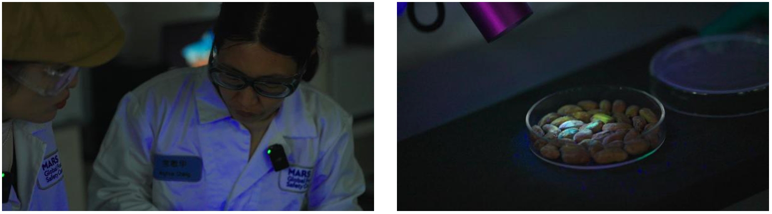 真菌毒素风险管理团队的常敬华博士(中国农业科学院博士,跑步爱好者)展示了玛氏的解决方案:荧光分选技术。在特定紫光灯下,看似正常的花生若呈现亮黄绿色荧光,可能存在霉菌污染及黄曲霉毒素风险。这套技术比人工色选速度更快、准确率更高,能高效剔除风险花生,为未来食品安全体系储备底气。