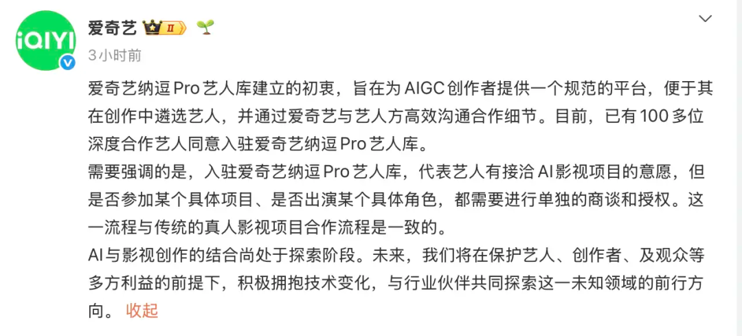 舆论发酵几小时后,爱奇艺官方微博发布关于AI艺人库的声明。