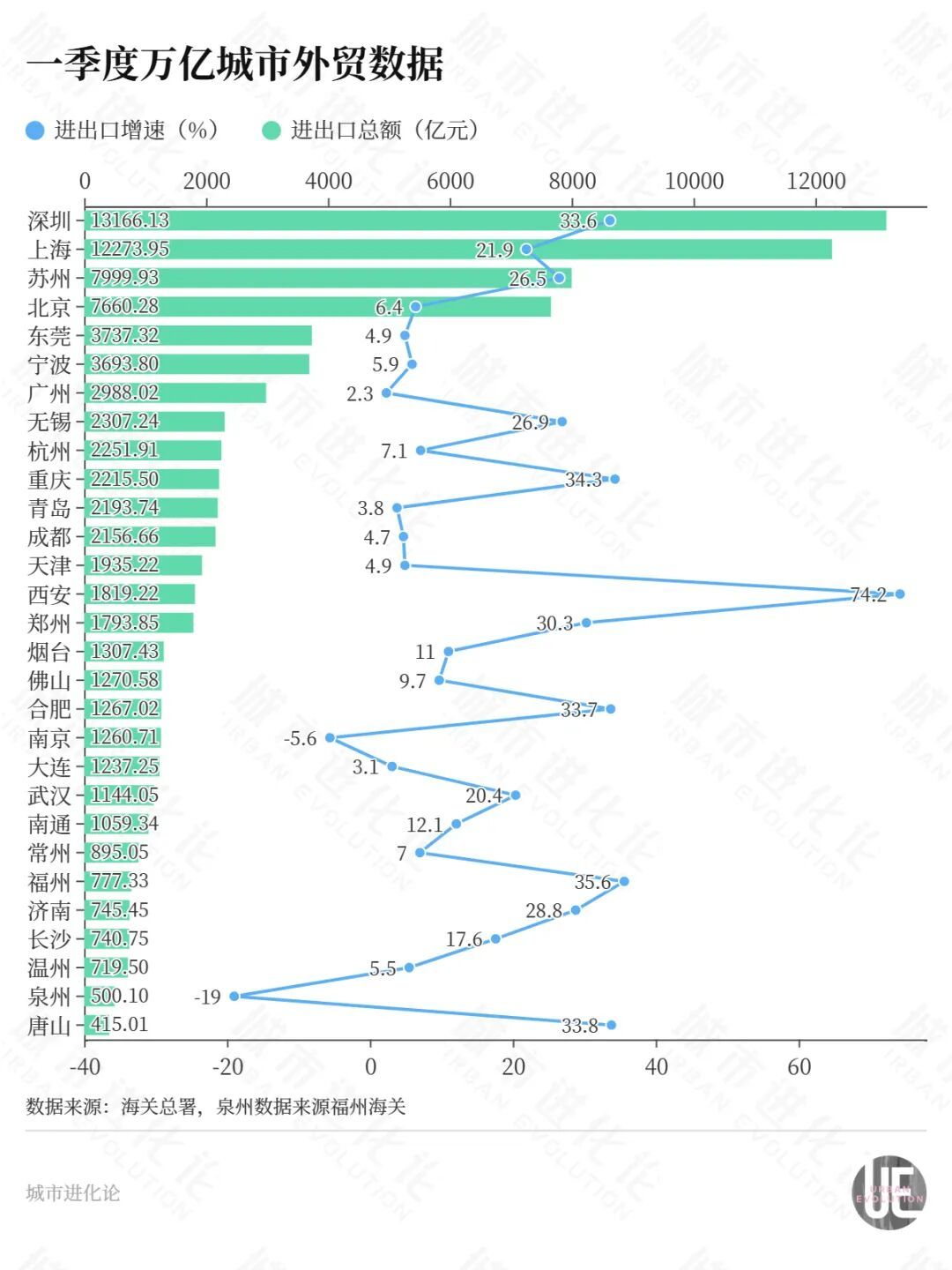 位于西部内陆的西安,抓住了产业风口。今年一季度,西安外贸进出口总值1819.22亿元,同比增长74.2%,其中出口1414.06亿元,同比增长95.9%;进口405.16亿元,同比增长25.7%。这一增速不仅领跑全国万亿城市,还比第二名重庆高出近40个百分点,打破了去年郑州的纪录,将一季度万亿城市外贸增速冠军的“天花板”提升了30多个百分点,发展势头十分强劲。陕西省经济学学会原副会长曾昭宁分析,西安外贸的强劲增长主要由出口驱动,半导体、新能源汽车和光伏等重点产业提供了有力支撑。三星、比亚迪、隆基绿能等龙头企业在全球市场具备较强竞争力,也体现了西安在这些新兴产业领域的优势。