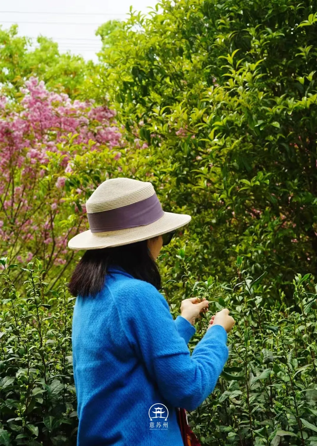 身着蓝衣的采茶人穿梭在茶垄间,指尖轻捻嫩绿的茶芽,鲜叶在掌心缓缓舒展。身后的茶园层层叠叠如绿浪翻涌,远处粉花满枝与茶树鲜绿相映,将光福的春日晕染得明艳又温柔。