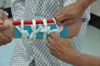 2.适度缚扎:用布条、腰带等在伤口上方(近心端)约10厘米处或伤口上一个关节部位缚扎,松紧度以能伸入一指为宜,避免用止血带。每30分钟放松2-3分钟,到达医院后及时解除。