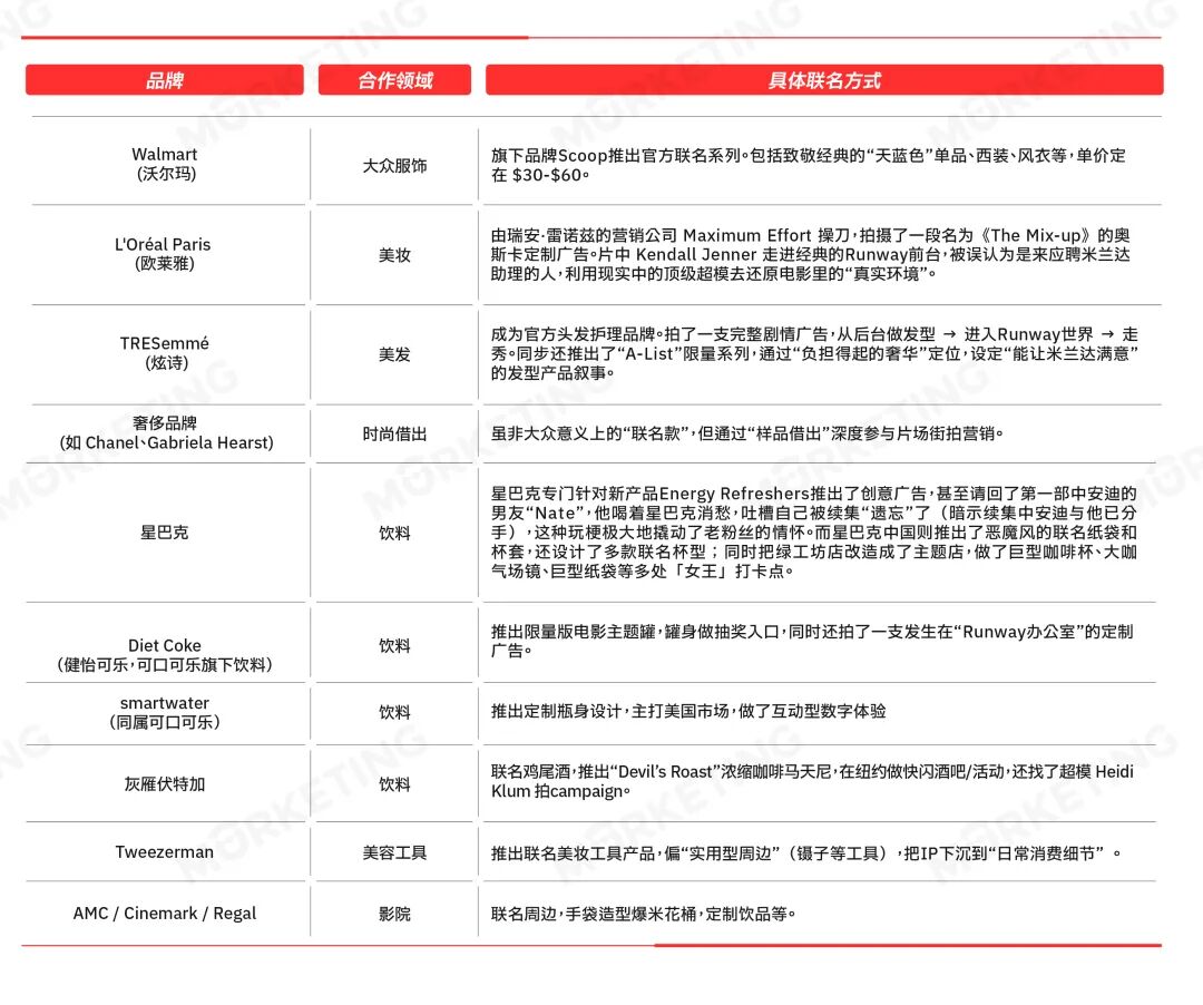 相比第一部以奢侈品牌为主的“高冷叙事”,这轮合作明显外扩,涵盖商超、饮料、美妆、影院等领域。这一现象既反映时尚权力的结构性转移和品牌资产定义权的重新分配,也因“时尚职场”母题有极强延展带宽,从美发工具到咖啡再到零售,品牌都能找到不违和的叙事切入点。