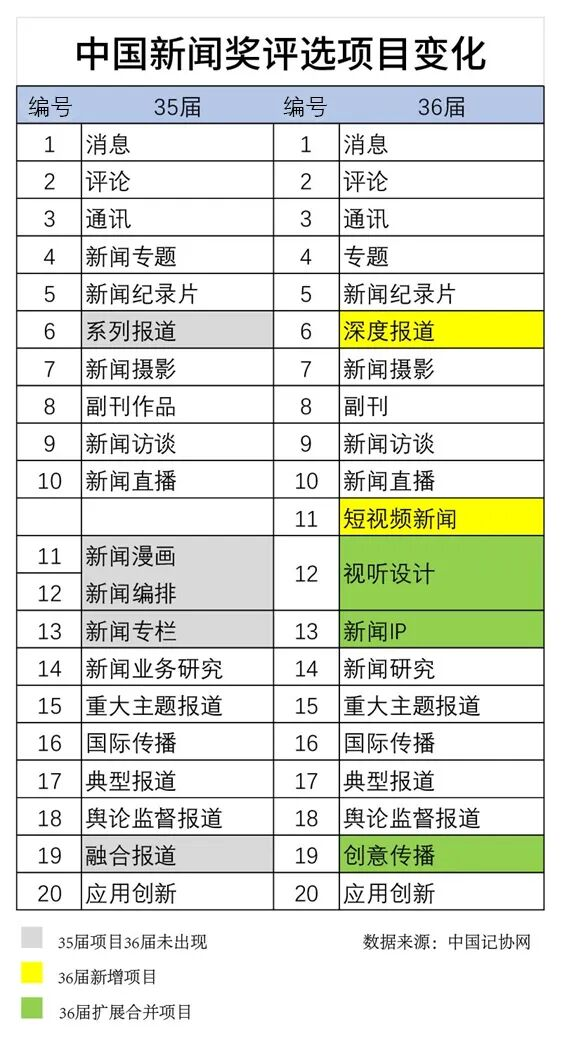 2026年4月7日,中国记协网发布第36届《中国新闻奖评选办法》。本届共设20个评选项目,其中5个为第35届未出现的新项目,占总数四分之一,是近五年来中国新闻奖评选项目首次较大幅度调整。