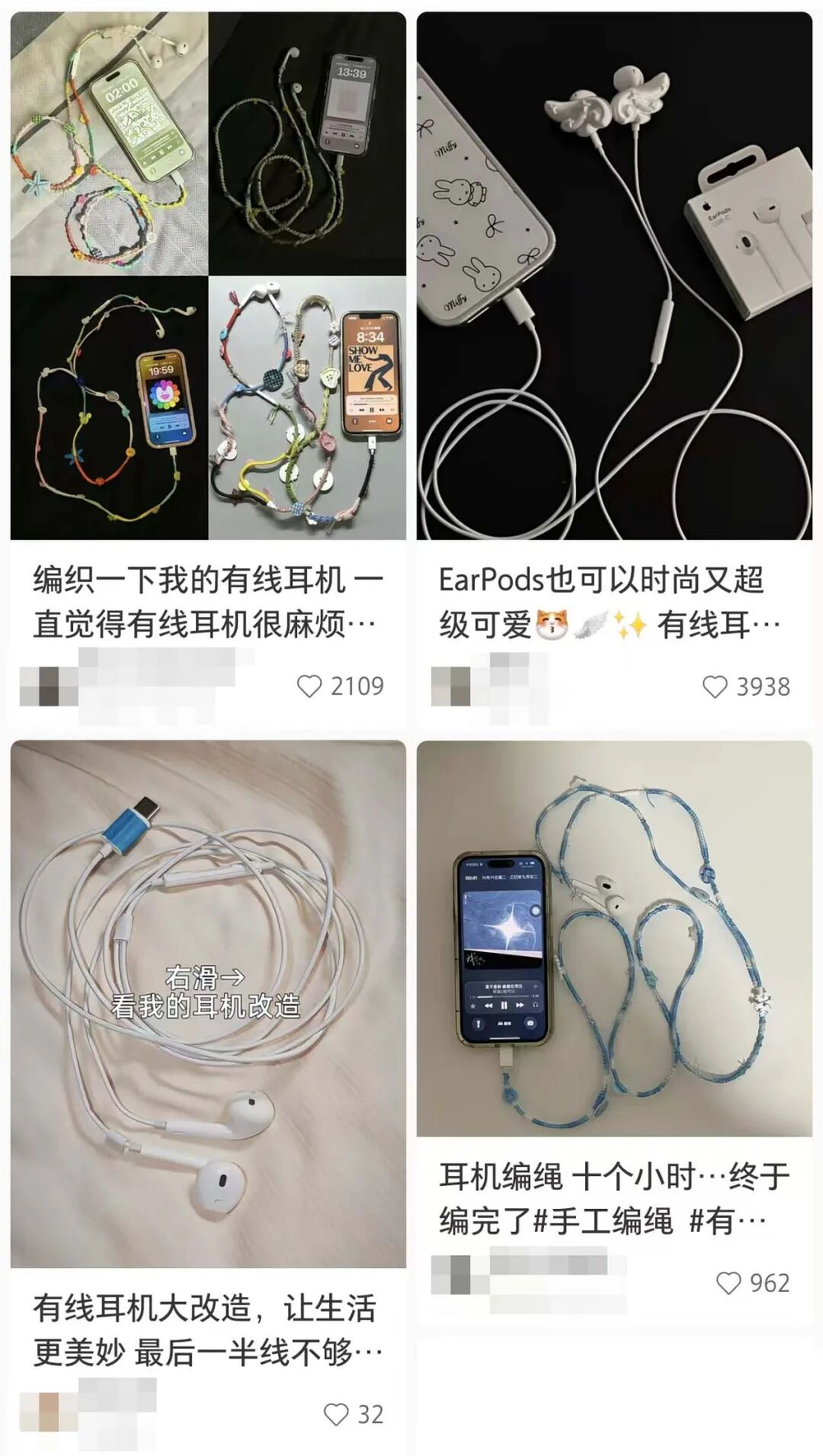 不少人改造白色耳机,有人编绳花了十小时。(图/小红书截图)
