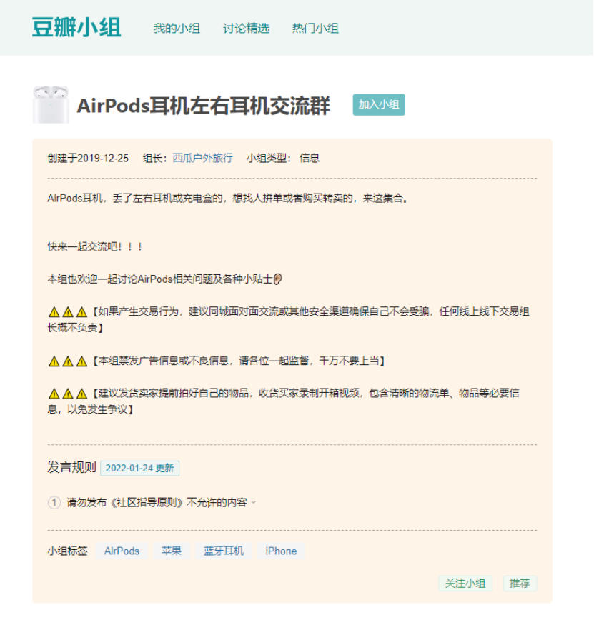 豆瓣有专门的AirPods交流小组,为“离异”的AirPods家庭提供交流机会。(图/豆瓣)