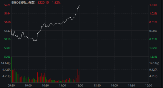 今日盘中,电力板块大幅走强,Wind电力指数由跌转涨,截至午间收盘上涨1.52%。