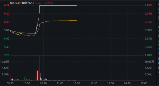 电力板块却逆势大幅走高,多只个股盘中直线拉升,粤电力A(000539)、广安爱众(600979)等均在10分钟内快速涨停。