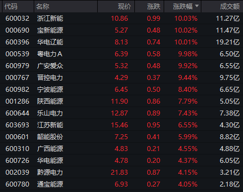 板块内多只个股表现亮眼,浙江新能、宝新能源、华电辽能、粤电力A、广安爱众涨停,晋控电力逼近涨停,宁波能源涨超8%,陕西能源、乐山电力等涨超7%。