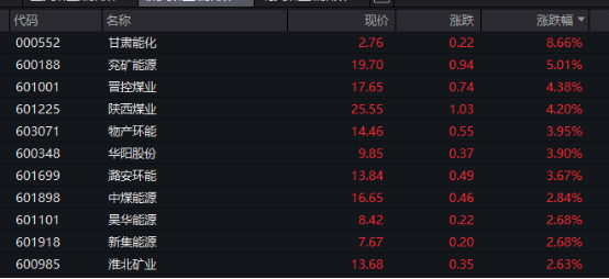 行业板块方面,按申万一级行业划分,煤炭板块领涨,涨幅超2%,甘肃能化、兖矿能源、晋控煤业、陕西煤业等个股涨幅居前。