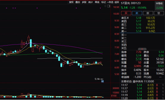 今日上午ST板块出现调整,整体表现低迷,ST亚光(原亚光科技)遭遇“20cm”跌停。