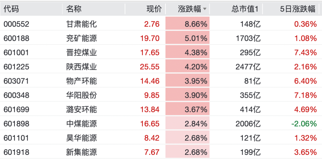 个股方面,中国神华上涨1.77%,甘肃能化上涨8.66%,兖矿能源上涨超5%,中煤能源、陕西煤业、晋控煤业、华阳股份、潞安环能、昊华能源等个股也纷纷飘红。