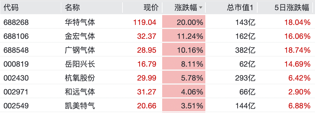 工业气体概念股再次大涨。个股方面,华特气体录得20cm涨停,广钢气体、金宏气体均上涨超10%,和远气体、凯美特气、杭氧股份等个股跟涨。
