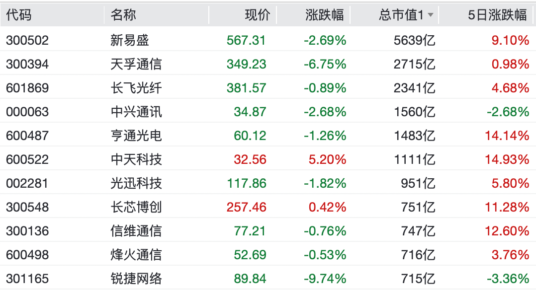 通信设备板块下挫,此前涨幅明显的CPO板块迎来回调,相关个股集体调整。