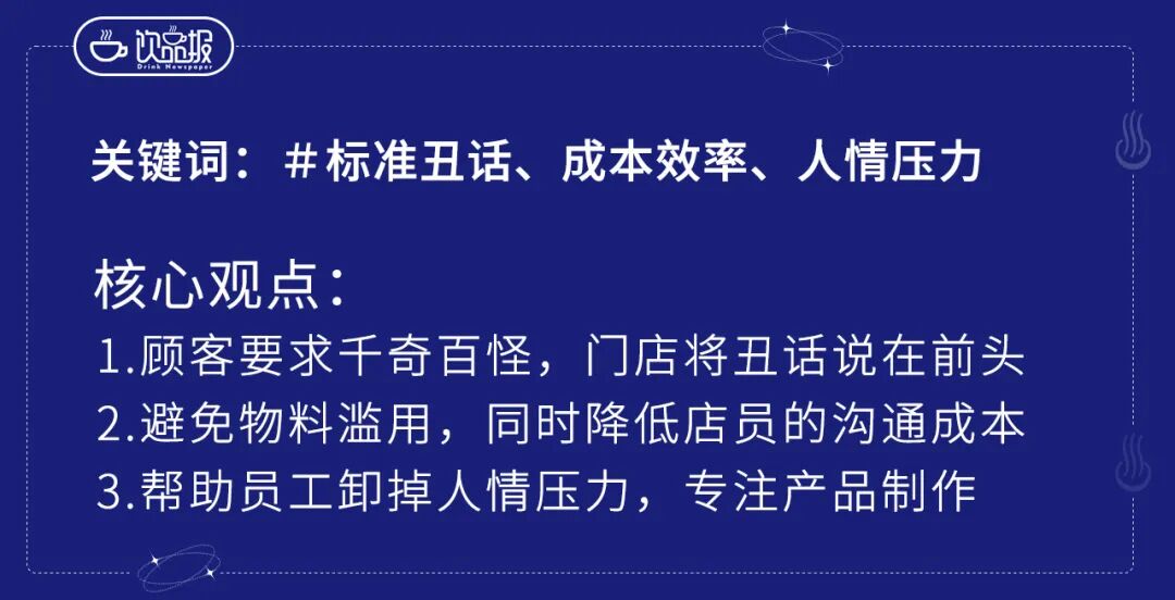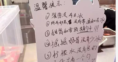 “去咖啡液的咖啡”“常温冰沙”等要求,不仅违背科学,更打破门店标准化操作。奶茶的糖浆量、茶汤量、冰块数均有固定标准,随意改动会影响风味。品牌既怕员工私改配方,又怕出品不统一引发投诉,员工夹在中间成“夹心饼干”。与其反复解释,不如用告示“丑话说在前头”。