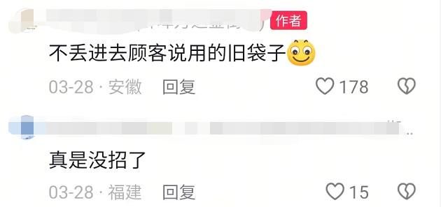 配文称“只有奶茶店员懂这个条条为什么丢里面”,博主解释“不放进去,顾客说用的是旧袋子”,而其他员工跟评“放进去又会被说乱扔垃圾”。