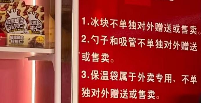 冰块不单独赠送或售卖,勺子、吸管同理,保温袋为“外卖专用”不另赠……这些“丑话说在前头”的提醒,满是店员被追要物料的无奈。