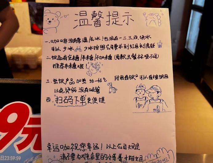 蜜雪冰城的手写提醒中,有“都是00后,请不要叫阿姨”;部分品牌写明“服务不满意请找店长,勿责怪店员”。