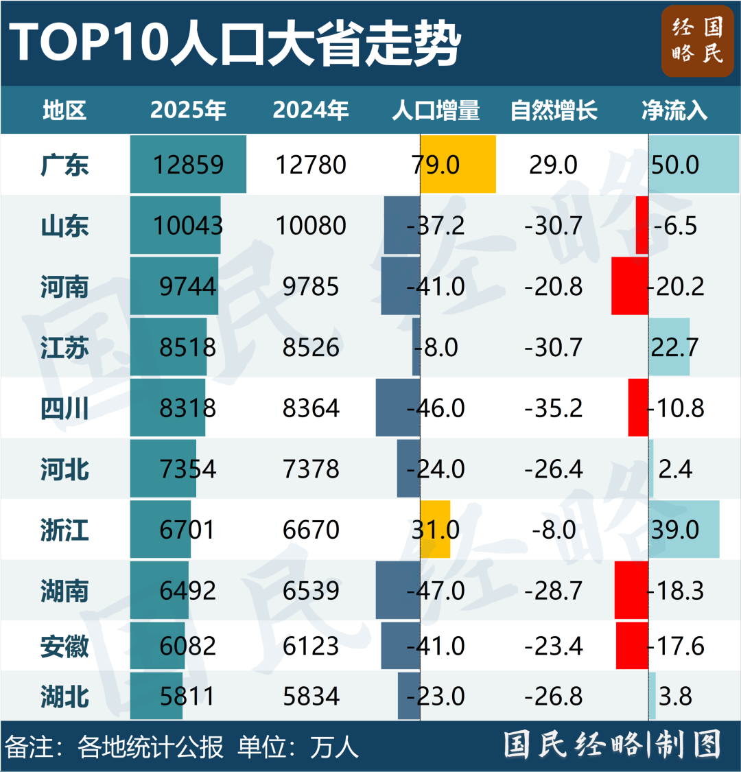 广东是少数同时具备自然增长与人口净流入双重支撑的省份,在经济大省中独一无二。
